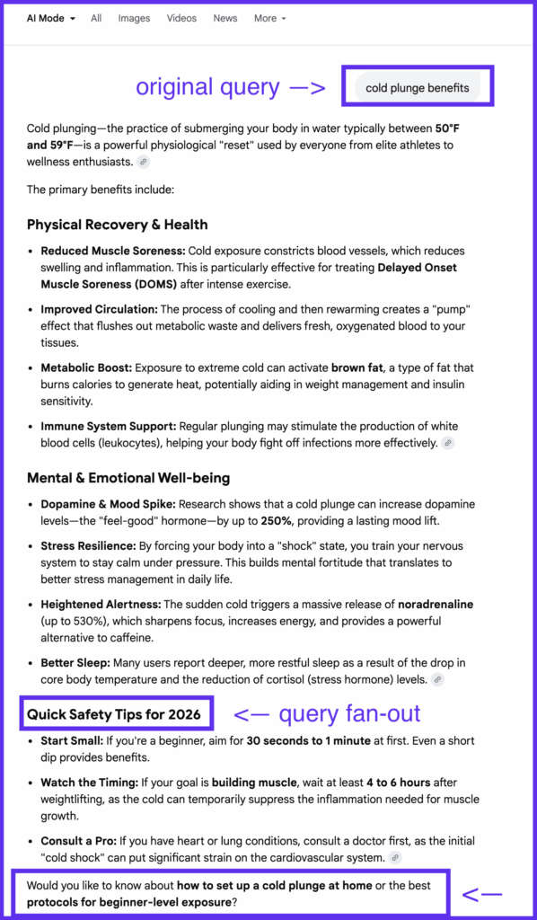 For example, a search for “cold plunge benefits” rarely stands alone. Google implicitly explores recovery, inflammation, safety, frequency, and evidence. It then evaluates which sources address those ideas consistently and accurately, and includes them in the list of citations and recommended websites.